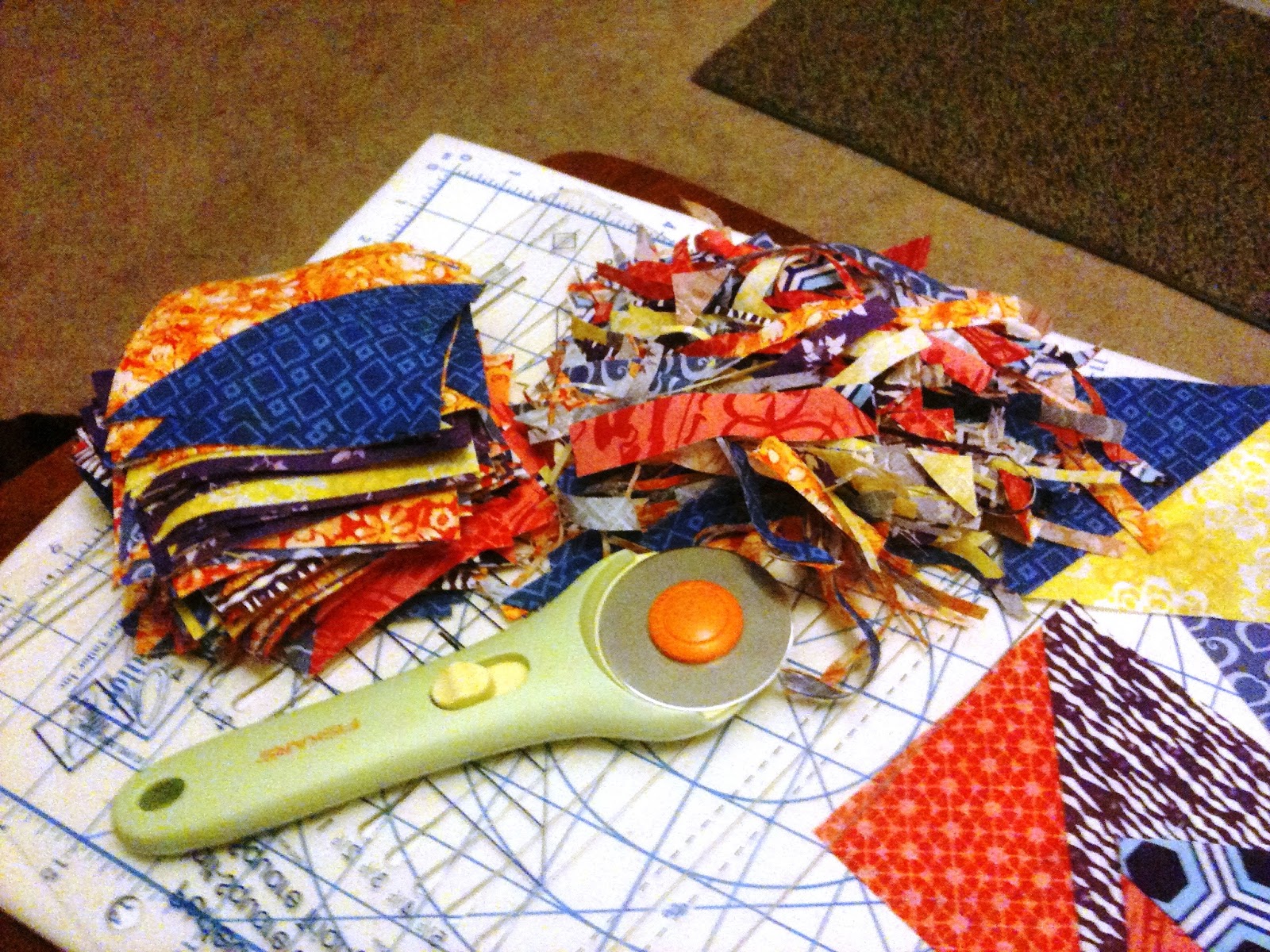 On another note, I finished up squaring all my HSTs for the warm cool QA. They ended up small, at 4" instead of 4.5". I must have misread the ruler when I posted about this before. Talk about a brain malfunction. I don't know. But at any rate, I ended up with quite a pile of trimmings...