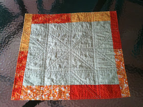 Here's a look at the backing. I pieced it together from the leftover scraps, which was annoying. I didn't have enough of the tan to do the whole thing. It was a last minute project so I didn't want to bother with binding. I just made the backing big enough to fold in on itself and then over again to the front and machine stitched it down. Blasphemous, I know. But I was lazy and in a huge hurry and it works. So there!