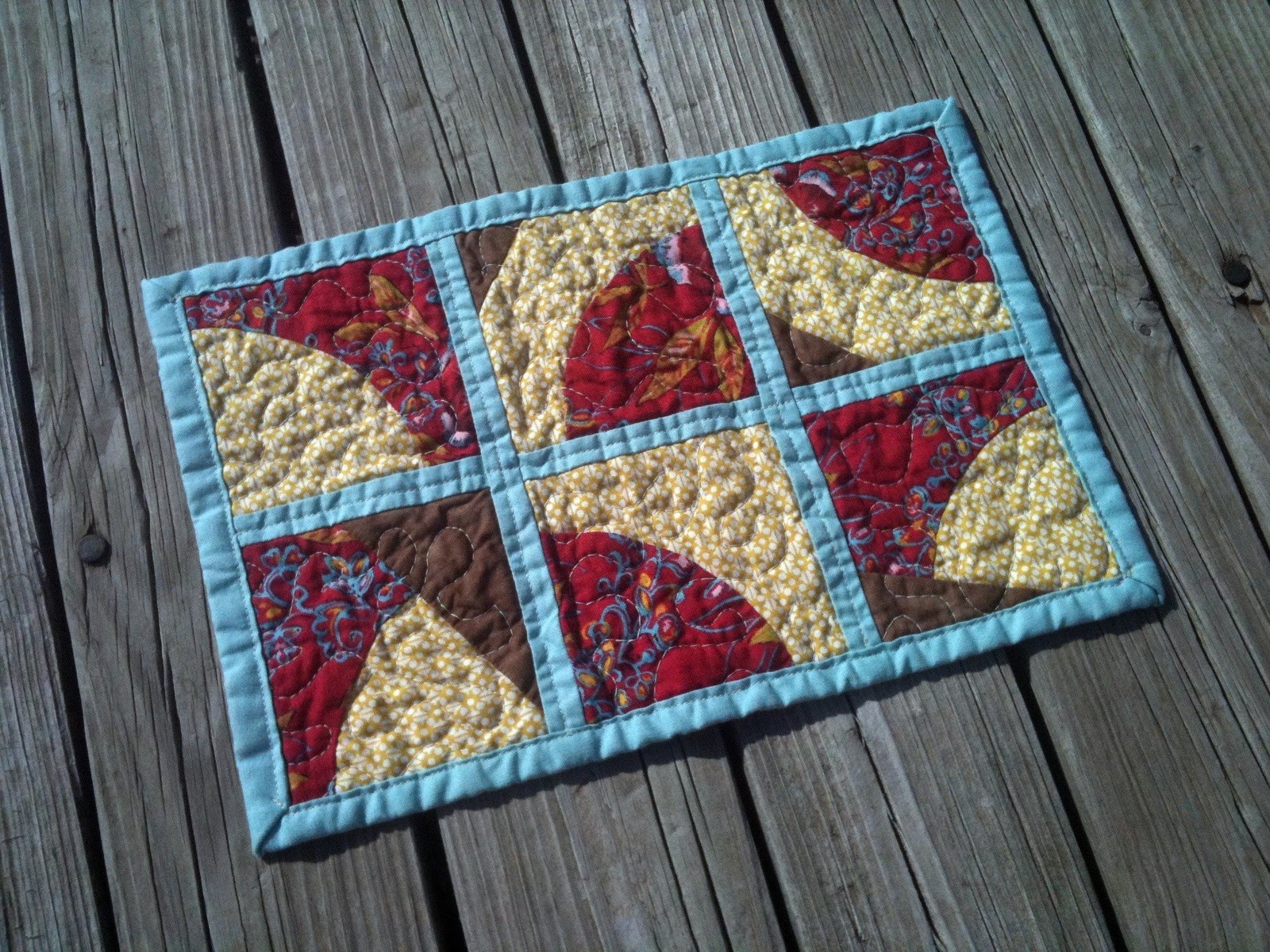 I brought it to work for my desk so I could have something quilty to put my coffee on. Now when I clumsily nudge my foam cup just enough to spill a bit over the edge, this will keep my papers (haphazardly spread out all over the place) from getting coffee marks on them. Although my dad always said you could tell the importance of any paper on his desk by the degree of coffee staining they had acquired. I always loved that :D