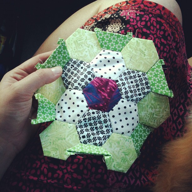 While out and about over the last week I got four new flowerburst hexie blocks finished. This is an ongoing project I started back in January, when I first fell in love with English paper piecing. I cranked out 50ish flowers to start with and then decided to add borders, which is a much slower process thanks to those little half-hexies.