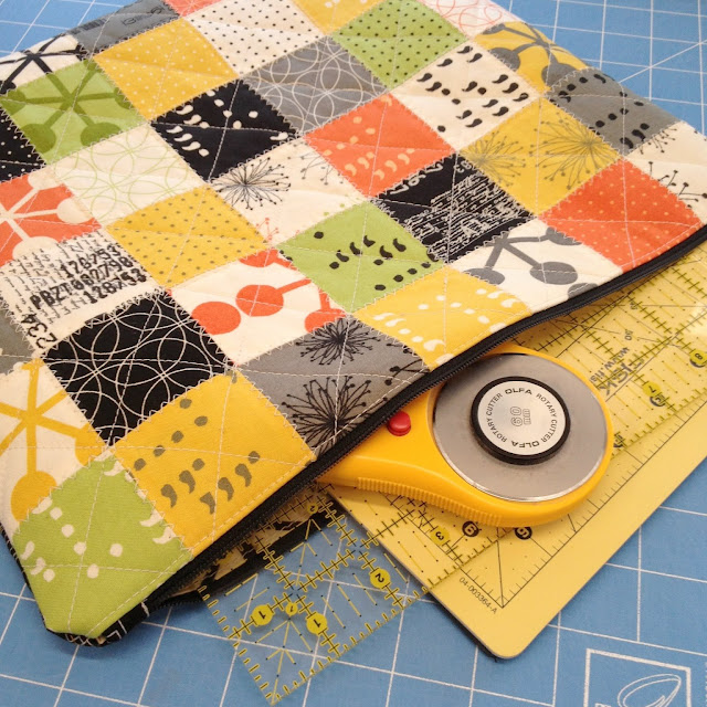 I'm very please with how it turned out, even though it took me a month and a half to finally install the zipper and finish the darn thing! It measures in at a generous 12x14 inches and will be perfect for carrying my rotating cutting mat, square rulers and other larger, flattish quilting tools when I'm traveling. And kudos to me for whipping up a post about it the same day I finished it!