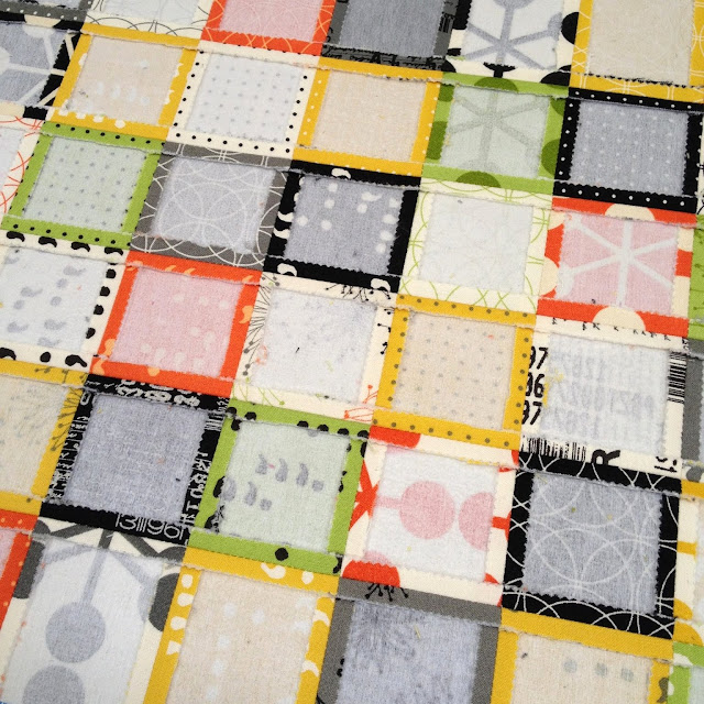 The Moda booth at Quiltcon was handing out free mini charm packs, comprised of 2.5" squares. I picked the Comma line by Zen Chic and immediately sewed it up into a simple patchwork panel when I got home. I pieced them using the fusible interfacing method, mostly because I planned to make a zip pouch from it and figured the stiffer it was, the better.